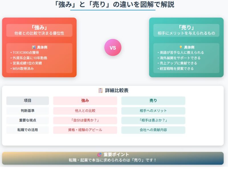「強み」と「売り」を見つけるには、まず両者の違いを正しく知ることが大切です。この違いを理解することが、的確な自己分析の第一歩となります。