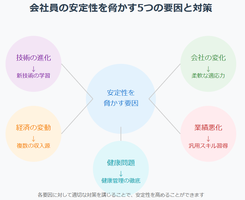 これらの要因に対して早めに準備しておくことで、会社員としての安定性を高めることができます。