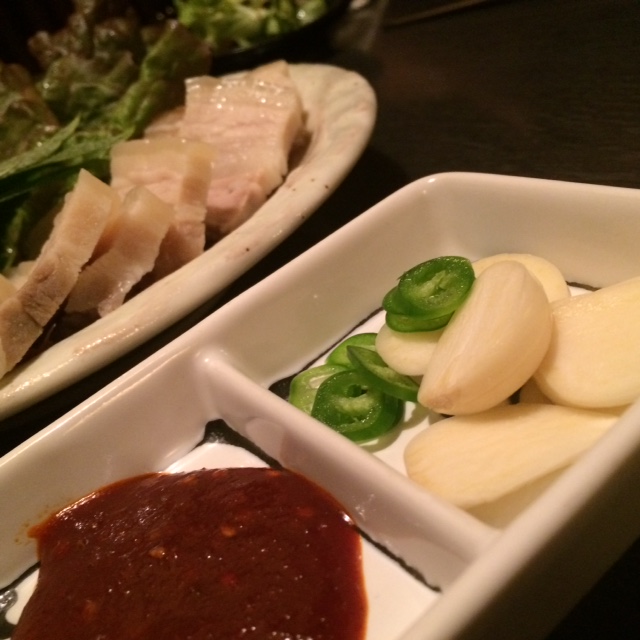 ニンニクとコチジャンのようなタレをちょっとつけて食べると