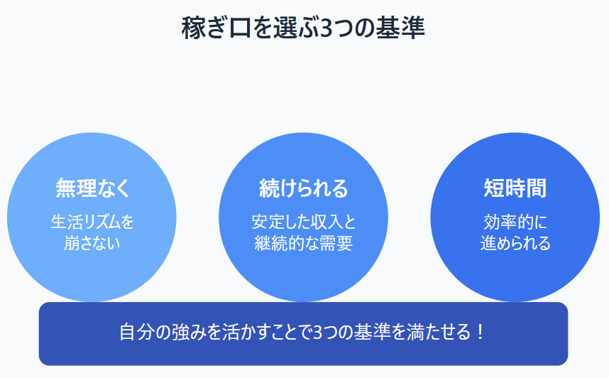 では、どのような稼ぎ口を選べばいいのでしょうか。以下の3つが重要な判断基準です。