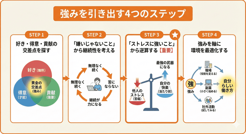 最後のステップは、見つけた強みを実際に「仕事」として機能させるための工夫です。