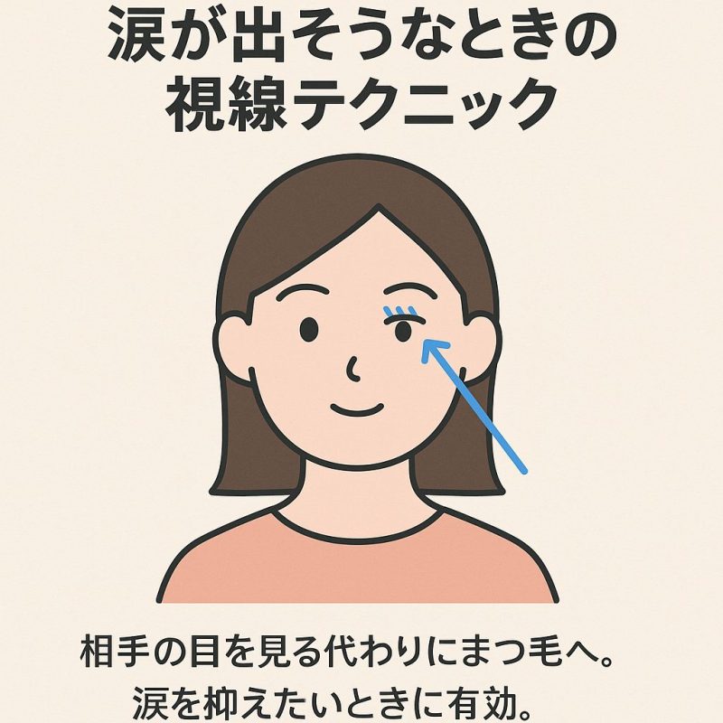 具体的な方法としておすすめなのが、相手の「まつ毛」を見ることです。相手の目を見るのが基本ですが、涙が出そうなときは、視線を少しずらしてまつ毛あたりに集中します。