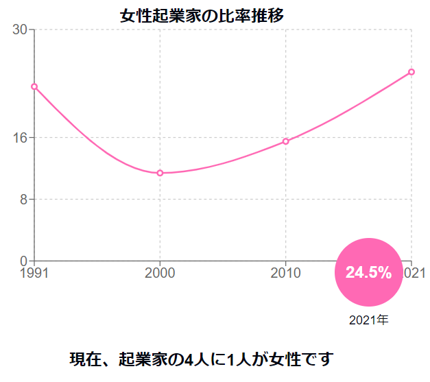 さらに、起業家の中での割合も全体の24.5%まで上昇し、4人に1人が女性です。