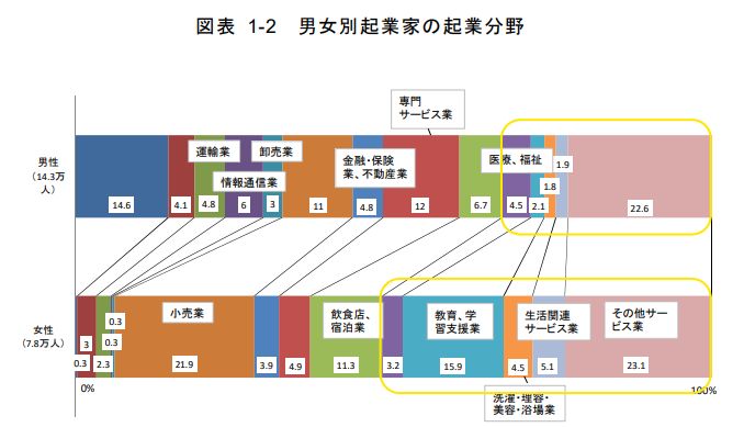 女性起業家の多い業種や職種ですが、産業経済研究委託事業による統計結果によると、