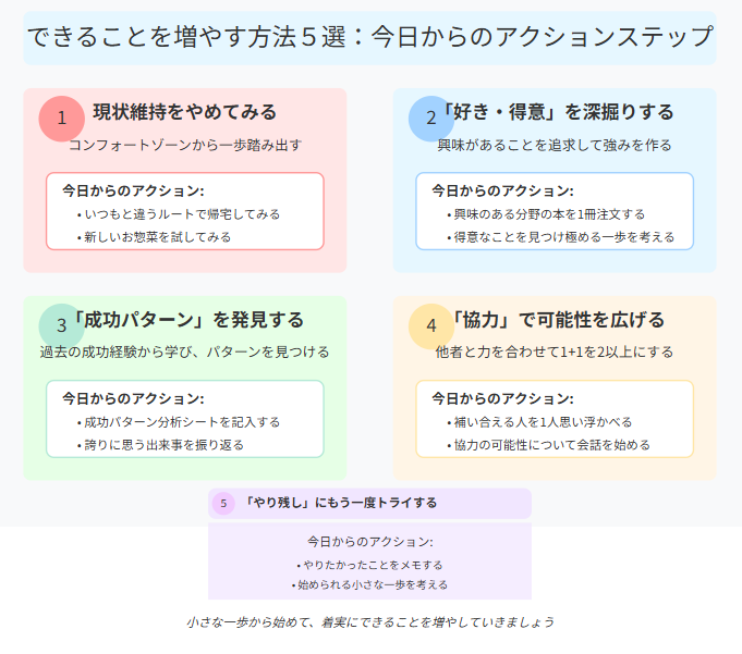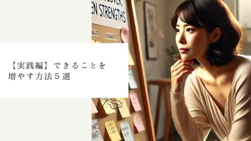 ここまで、できることを増やすための具体的な方法や、それがもたらす変化についてお伝えしてきました。