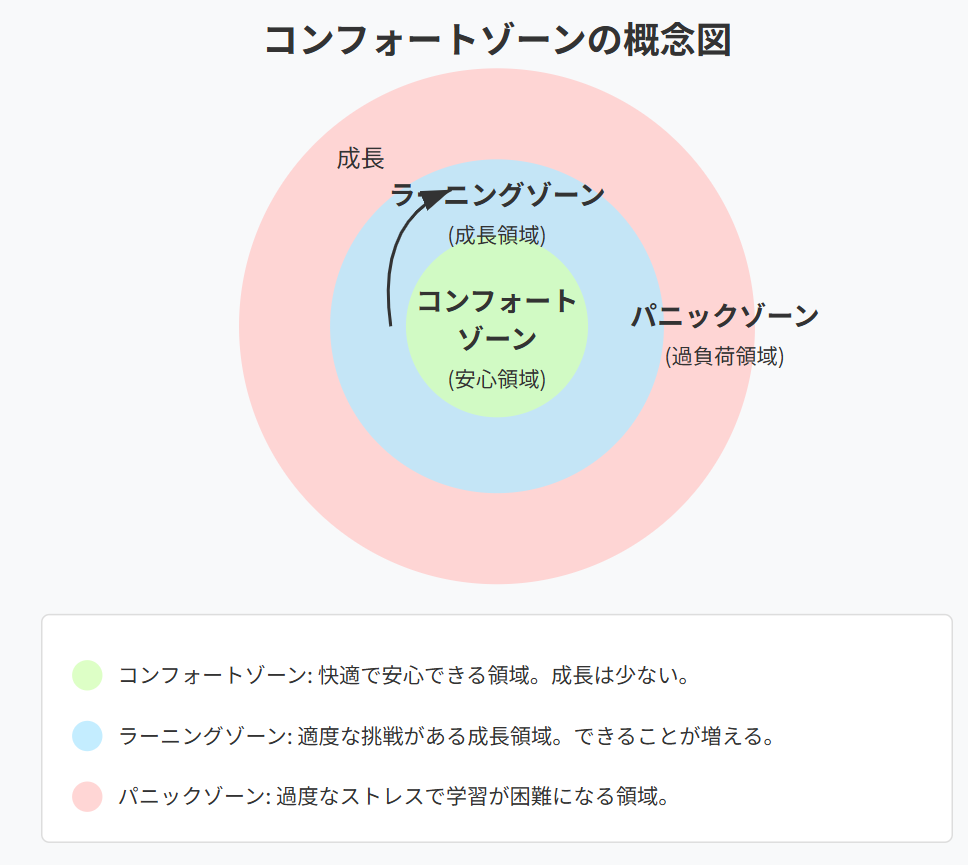 コンフォートゾーンとは、自分が慣れ親しんでいて、「楽だな」「安心だな」と感じる心理的な安全領域のことですね。