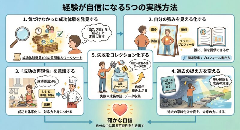 ここまでご紹介した「経験が自信になる5つの実践方法」。これらを実践することで、自信をつけていくことができます。
