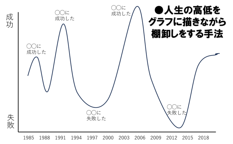 年齢(西暦)順に人生の高低をグラフに描きながら棚卸しをする手法です。