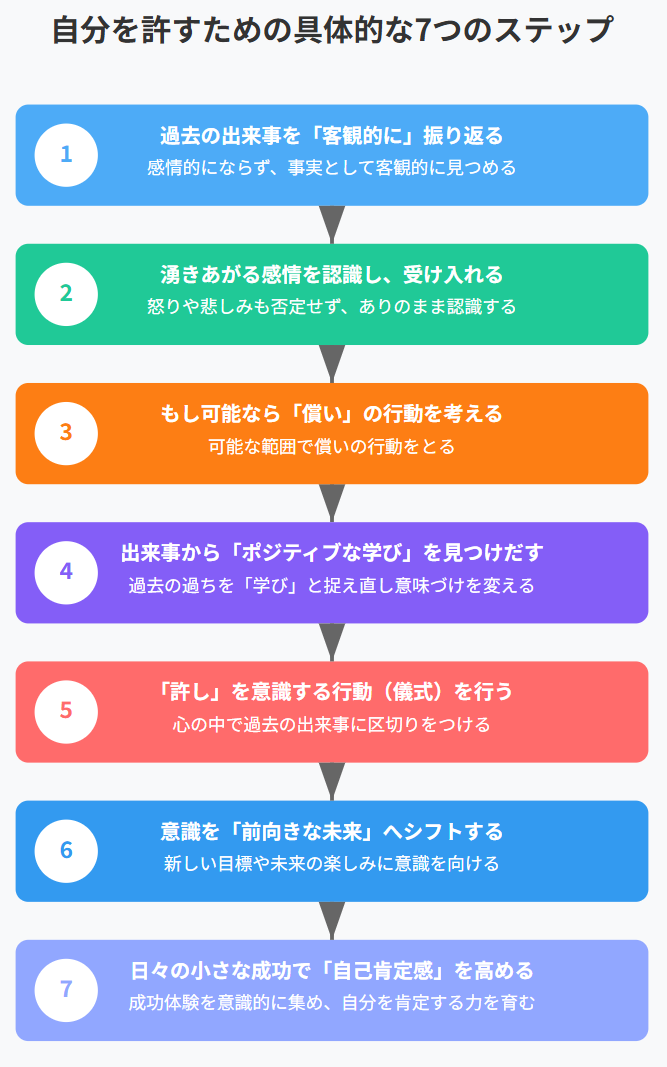 無理せず自分のペースで一つずつ進めていきましょう。このステップは順番通りに実践することで効果的に自分を許す力が育まれます。それでは各ステップについて詳しく見ていきましょう。