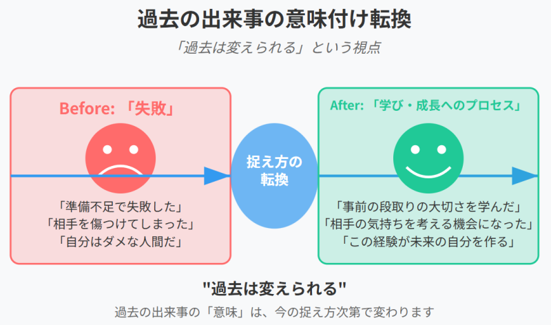 こうすることで、過去の出来事は、単なる「失敗」ではなく、未来へ繋がる貴重な「プロセス(経過)」へと意味合いが変わります。