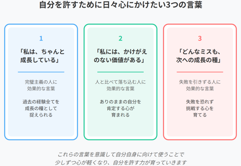 これらの言葉を日常的に自分自身に向けて使うことで、自己肯定感を高め、自分を許す力を育てていくことができます。