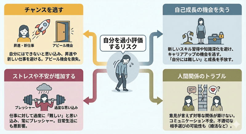 自分を過小評価するリスクについても解説しますね。自分を安売りしないようにしようという意欲が高まりますよ。
