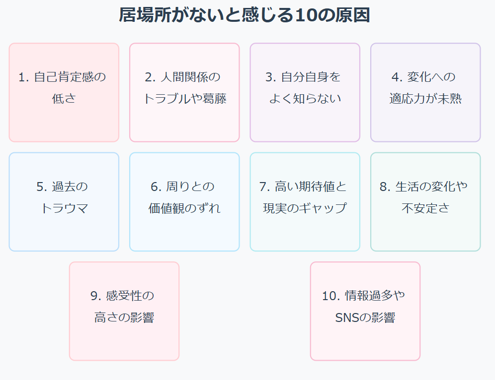 人間関係のトラブルは、心の安定を欠いた状態を生み、「居場所がない」という感覚を生む主な原因の一つとなります。