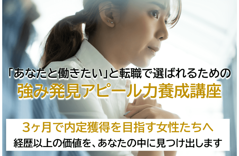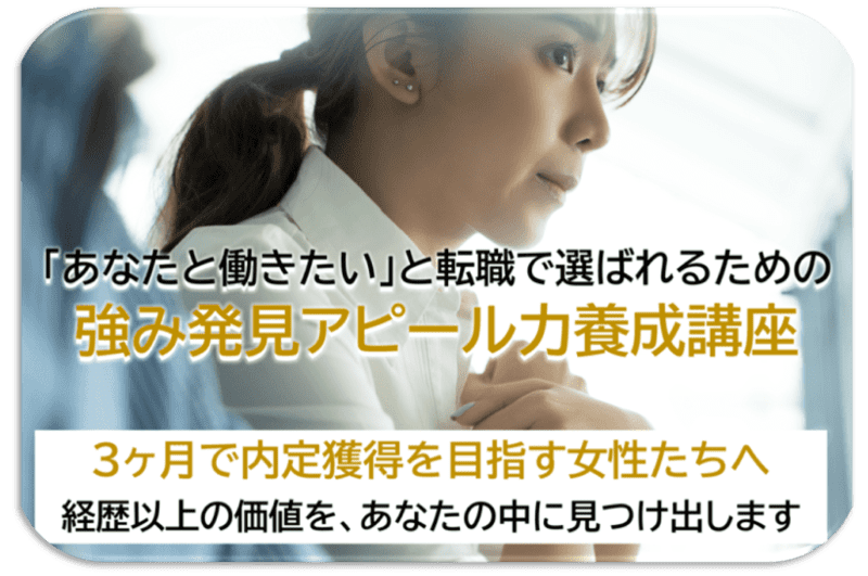 この講座では、隠れた強みを3ヶ月で見つけ出し、転職市場で他の人とは違う魅力をアピール。会社から「選ばれる人材」になることを目指します。