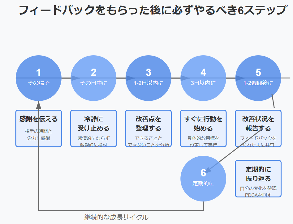 これにより、相手は次回も喜んでフィードバックを提供してくれるようになり、継続的な成長サイクルが生まれます。
