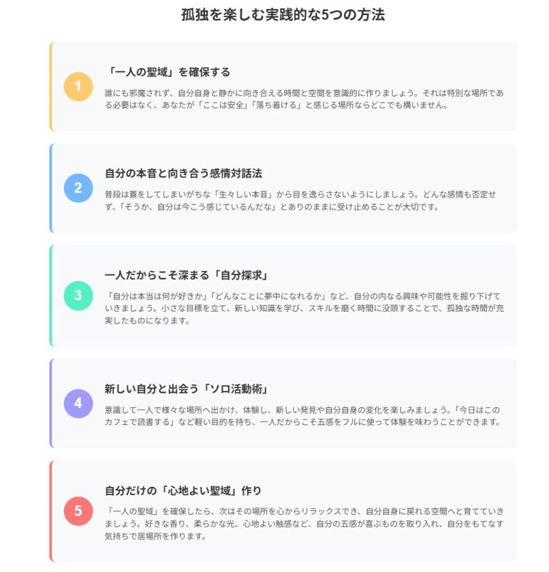 むしろ、他者の視線や期待から解放され、本当に自分らしい状態に戻るための、大切なひととき。そう捉え直すことから、孤独を楽しむ第一歩が始まります。