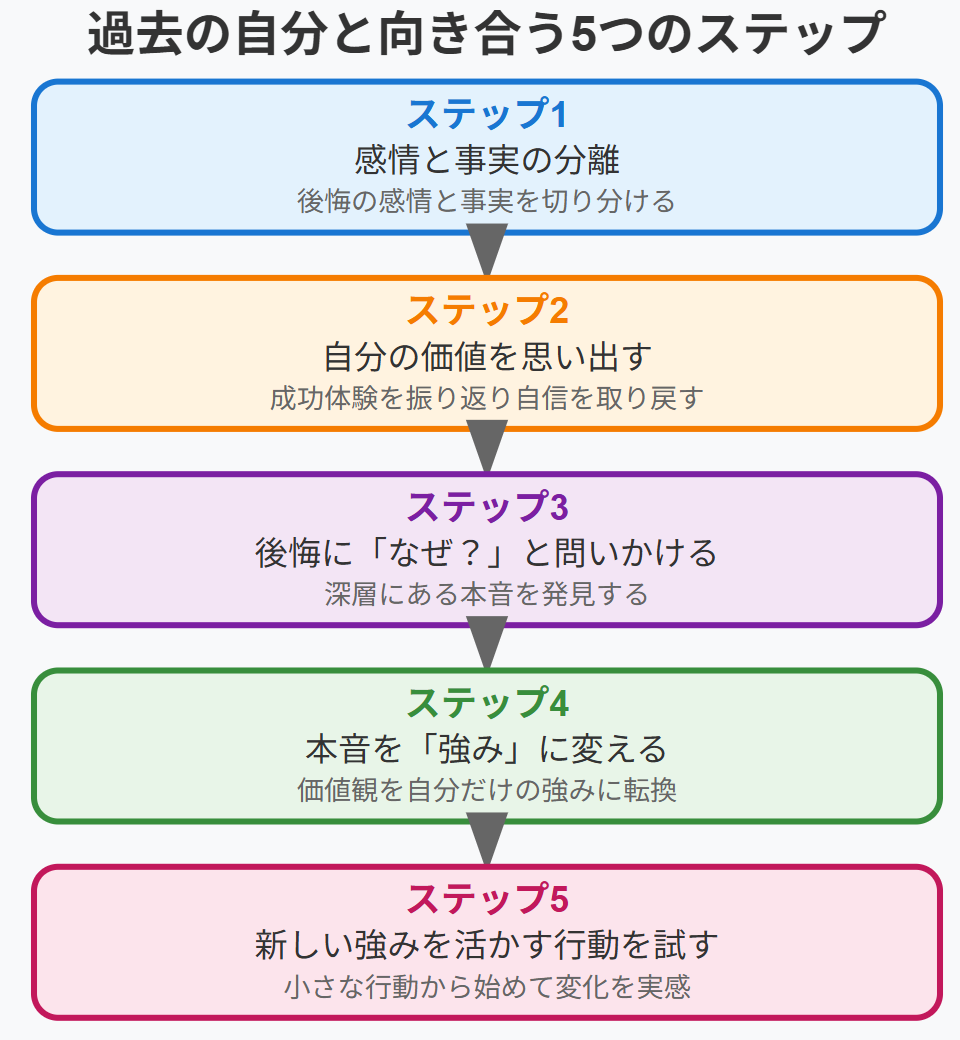 いよいよここからは本題です。過去の自分と和解し、後悔さえも成長の糧に変えるための、具体的な5つのステップを解説します。