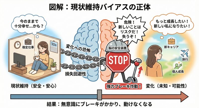 そもそも現状維持バイアスとは、たとえ現状に不満があっても、変化を避けて今のままでいようとする心理作用のこと。