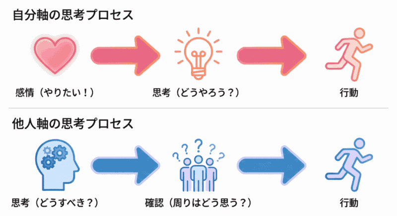 頭の中の順番がこれだけ違います。 自分軸は感情から、他人軸は思考からスタートします。 この最初のステップが違うだけで、行動のスピードや納得感に大きな差が生まれるのです。