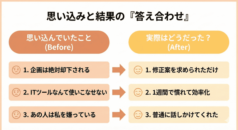 ●思い込み①「この企画は絶対に却下される」 → 実際:修正案を求められただけだった