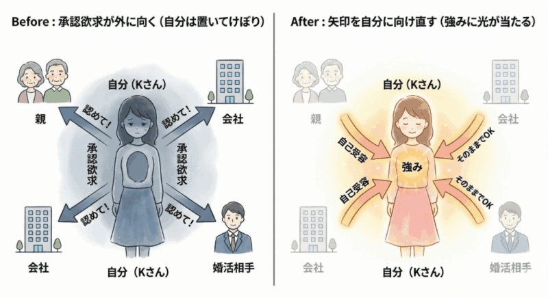 Kさんは無意識に親以外の誰かに認めてもらうことで自分の価値を証明しようとしていたんです。