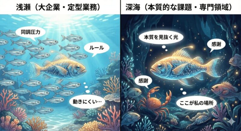 だけど、深い場所——本当に困難な問題に直面した時、深海魚タイプの人は輝きます。