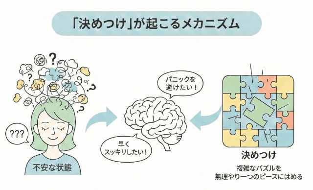 その結果、気づかないうちに「もうこれしかない」と決めつけてしまうことがあるのです。決めつけが起こる心理的なメカニズムの図解