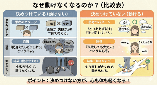これは慎重さの表れですが、決めつけと結びつくと、「間違えそうなら、最初から動かない」という形になりやすくなります。