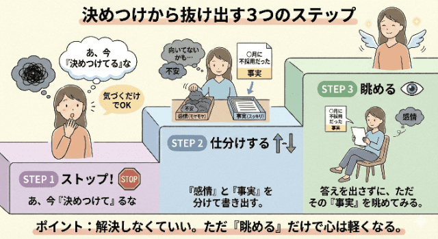決めつけから抜け出す3つのステップの図解インフォグラフィック