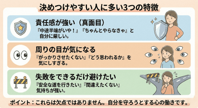決めつけやすい人に多い3つの特徴の図解インフォグラフィック