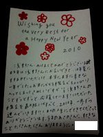 大きな大きな年賀状が届きました。A4サイズ。でかい(汗)ザ・プロフィール講座あさの組2期卒業生。ヤンキー副社長こと清水めぐみさん から。さすがやることがダイナミック。彼女が副社長を勤める(有)アート建装 のDMを兼ねている年賀状です。裏を見...